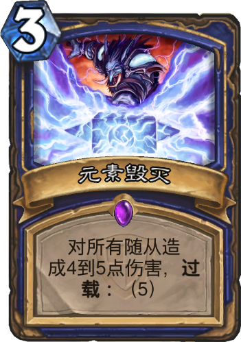 这张卡是闪电风暴的加强版,不过5费的过载成本也非常大。这张卡的优势在于低费且强大的AOE伤害,你可以在铺场的同时解掉对面的场,而且,如果你手牌中有熔岩震击的,可以让你的过载损失降低到最小。元素毁灭与萨满的铺场机制相辅相成,所以给构建卡组提供了一个思路。虽然这张卡不是最好的一张,但却是非常强大的一张牌。