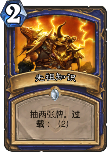 萨满名单上的另一张过载卡,先祖知识是除法力之潮之外的另一个补牌手段,这张卡于法师的奥术智慧相比,同样都是抓2张,但奥术智慧需要的是3费。虽然过载2费,但在缺牌的情况下法力水晶往往用不完。同时过载2费也可以用来BUFF坑道穴居人。