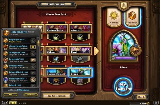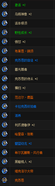 克苏恩强化随从方面,没有选择比较弱小的二费生物邪灵召唤师,满编了三费的蓝猫、四费的圣盾4/2和六费的职业卡黑暗鸦人。为了避免卡手的风险,也只带了一张卡拉克西英杰。