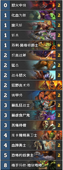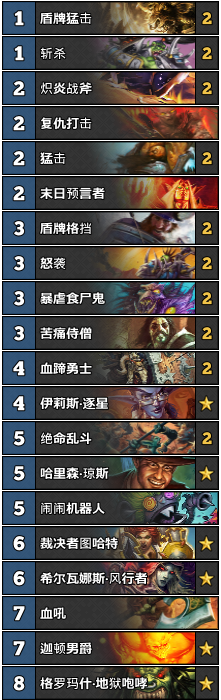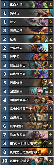 这是一个新型的中速战士套牌,利用战斗怒火过牌找到胜利关键:通常是格罗玛什、拉格纳罗斯,甚至是瓦里安·乌瑞恩;然后一些强力的生物如暴乱狂战士、血蹄勇 士等搭配战士的小型AOE和激怒效果能够有效除去敌方的随从。节奏战已经迅速成为很多职业选手所选用的战士套牌,风靡天梯和比赛中,也拿到了不错的成绩。 节奏战作为战士的变种套牌,利用战斗怒火保持过牌,极其灵活的随从搭配各种除去手段,使得战士能够对场面施加更多的压力。