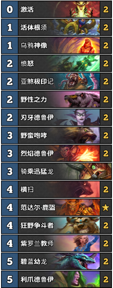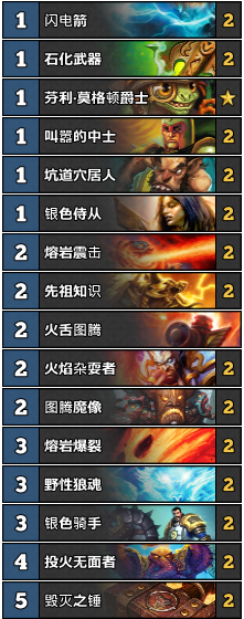 打脸萨是一套前期利用优质随从配合野性狼魂等过载系统抢夺场面、中期利用法术伤害搭配石化武器毁灭之锤。