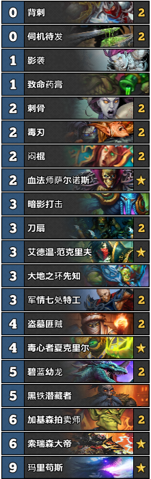 奇迹贼归来了!经典的瓦莉拉组合技套牌——使用加基森拍卖师迅速过牌奠定胜利条件,奇迹贼拥有不可思议的疯狂爆发能力,比如冷血、刺骨、毒药等低费就能造成致命伤害的法术。除此之外,新卡毒心者提供了十分便宜的毒素卡,也起到了关键作用,可以过牌或者打一些连击配合。奇迹贼是一套很难用好的套牌,但不妨碍它是炉石中极具魅力的套牌。在对抗中慢速套牌时,一个隐藏起来的加基森拍卖师能够帮助盗贼疯狂过牌找到火车王终结对面,但打脸萨仍然是这套牌的克星。奇迹贼还在不断进化和调整,玩家们仍在尝试找到最好的版本。