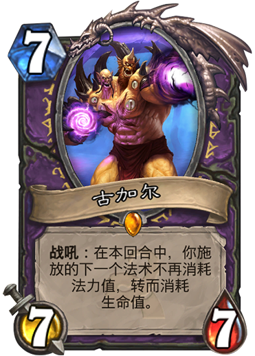 技能可以说非常有意思,本回合中的下一个法术不再消耗法力值,而是消耗本身英雄的血量。说明了古加尔注定是一张和法术卡牌一起使用的配合卡牌,没有法术的话只是一个777白板。