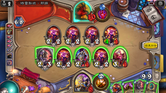 与普通模式不同,小鬼是2血,魔爆、大漩涡这种AOE就不好使了。考虑到这个BOSS的机制,选择脏牧吧,卡组构成就是2个偷+2个思维窃取,再来2个神圣新星,带满阿古斯,狂乱。剩下的全部换成2攻3血以上的低费墙、什么贴吧熊。复活牛头人这类的。偷过来的小鬼死亡后BOSS也会掉血。就用圣光脏死它吧。