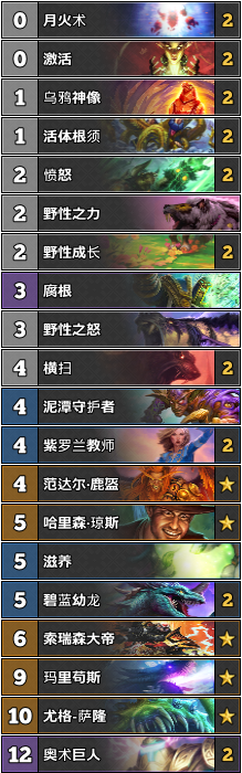 总结:平衡性的改动对天梯套牌的影响还是比较大的,斩杀的削弱让龙战开始偏向于后期,节奏放慢,失去了原有的强度。没有了尤格萨隆的青睐,节奏法和导演德看起来都不足够可靠,冲锋的致命削弱让OTK狼 人战或者奥术巨人战都从此销声匿迹,无论是恩佐斯骑或者鱼人骑都太慢了,对阵萨满较为劣势。兽群呼唤加了一费影响是立竿见影的,中速猎逐渐被玩家们抛弃, 打脸猎、奥秘猎有些出头的意味。不过,玩游戏最重要的还是开心,对休闲玩家来说,总使用毒瘤卡组也没什么意思,常常玩一些新奇的套路才能找回最初的乐趣, 比如随从只有巴内斯和亚煞极的小明术,4费就能铺场10-10加3-4加1-1,而弃暗投明后所给的随机卡牌也让人充满期待。