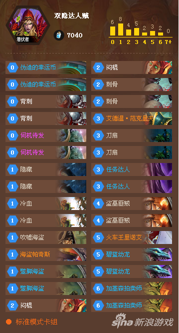 今天推荐的5套卡组分别是:酒色罪人的双隐达人贼;低调的河马的海鲜战;niceboll的大蓝龙宇宙法;夜雨声烦pkpkpk的经典动物园和炉石曲先森的狂野打炮贼。上分推荐双隐达人贼和海鲜战。