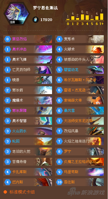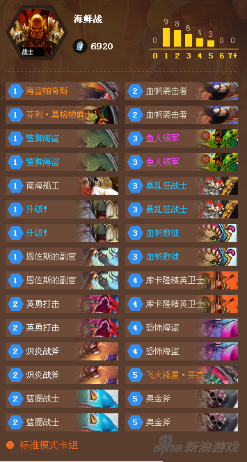 这应该是一套来源自外服的套牌。像这种极限的打脸思路在卡手的情况下很容易被雷诺劝退,尤其是整个卡组里没带任务一张过牌,所以建议拍板娘的时候请酌情考虑术士技能。不卡手的情况5费准时下飞火流星拉出领军+蓝腮还是能打出一波小爆发的,但是如果拉出的是芬利·莫格顿爵士……