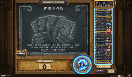 在本周的乱斗中,你需要自己组建一副套牌,不过只能使用基础卡和经典卡,而且不能含有史诗或传说卡牌。觉得自己虽然是个新手,但实力不输给大神?那么本周便是一个很好的证明机会,没有了强大紫卡和橙卡,且限制只能使用基础卡和经典卡,这就让很多现在流行的,或是强力的打法都无法适用,因此无论你是老玩家还是新玩家都站在同一条起跑线上,大家一起来比拼实力。这样的环境下,首先考验你的组卡能力,如何构筑一套有强度的套牌应战?其次考验你的打牌技巧,没有了能够翻盘的史诗卡和传说卡,每一步都需要加倍的仔细思考。如何用蓝白套牌打出水平?这周的乱斗一定能让你证明自己。