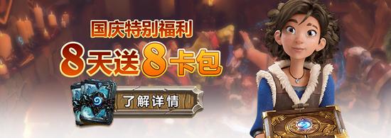 十一长假即将到来,不管是您是出游在外,还是宅在家中,都可以随时随地的玩上一把《炉石传说》,同时节日期间更有良心好礼大派送!只要您在国庆期间每天登录游戏并完成1场对战,就能获得1包“冰封王座”的卡牌包,总共有8包等你来领取!