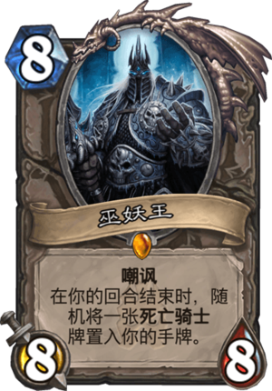 TOP6巫妖王,8费88,嘲讽,每回合结束后给一张死亡骑士牌,不亏身材,还可以补牌,无论是霜之哀伤,还是亡者大军在竞技场十分的出色,抢场面能力十分的惊人,深受广大玩家喜爱,版本第一橙,巫妖王见到必拿,单卡可能直接提高胜场。