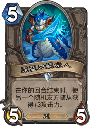 TOP3深蓝刃鳞龙人,5费55,回合结束时,使一个友方随从+3攻,十分的强,5费55的身材就不亏,对手必须解它,buff到就十分的赚,可以使随从发生质变,优势站场,站场多轮可以快速扩大优势,而且是龙,可以打出很多配合,也不受龙息术影响,必拿卡牌。