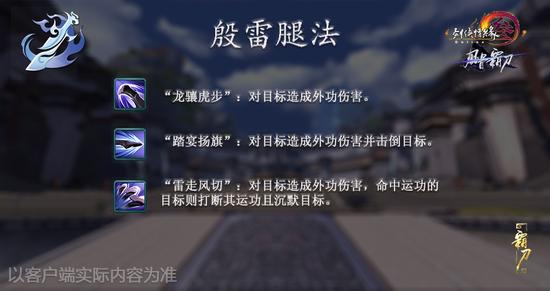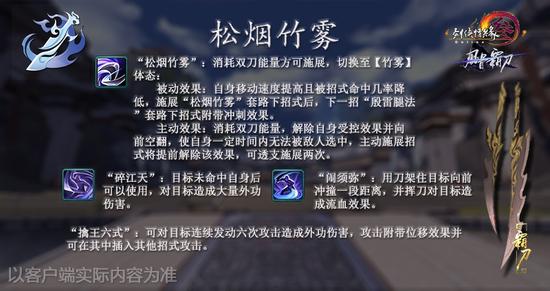 被动效果:自身移动速度提高且被招式命中几率降低,施展“松烟竹雾”套路下招式后,下一招“殷雷腿法”套路下招式附带冲刺效果。