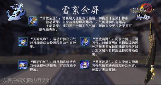 此套路武学需使用鞘刀,消耗鞘刀能量施展招式。凭借鞘刀中蕴含的凛冽刀气,或以刀气远程重创对手,或凭借挥舞刀气铸成气墙保护自己。