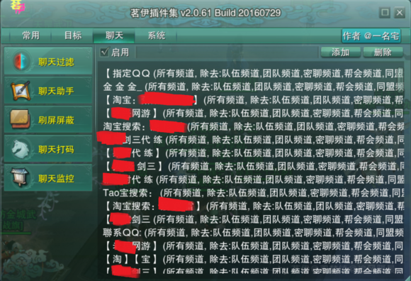 其中并没有需要更改的设置,不过“聊天过滤”“聊天监控”需要说明一下,聊天过滤中,可以过滤掉烦人的工作室广告关键字,如下所示: