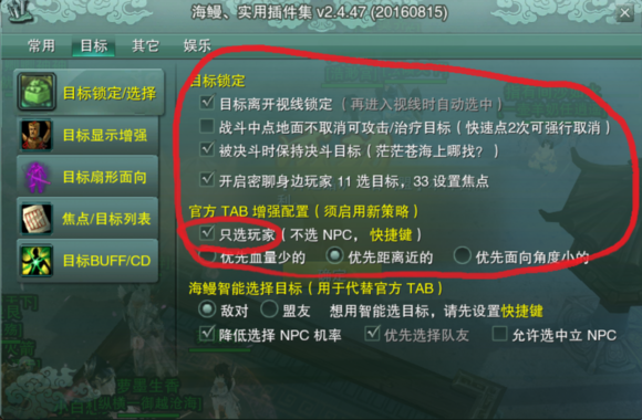 这里照着图示设置,其中“只选玩家”在PVP的时候有助于选择目标,避免一个Tab选到了一只蛤蟆并把大招打到蛤蟆上的尴尬情况,当然在PVE和休闲的时候就不要勾选这个了,毕竟副本里的小怪和boss都不是玩家。