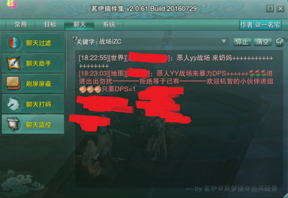 而聊天监控,对于寻找战场团的小伙伴来说就非常方便了,再也不需要时刻关注世界频道阵营频道,输入关键字“战场|ZC”,点击开始按钮(点了之后会变成停止按钮,再次点击即可停止搜索),即可实时监控各个频道的战场消息,麻麻再也不用担心我找不到战场团了。