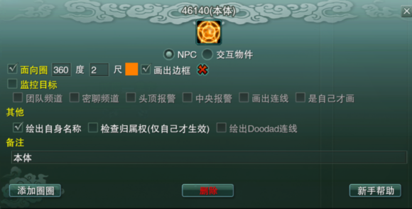 通过画圈圈我们可以直观地看到长歌留下的影子本体。面向圈360度,后面的尺寸大小自行调整,个人习惯2尺。下面的“绘出自身名称”是要显示出来的,显示的就是备注里的内容,至于你喜欢叫“本体”还是“长歌本体”甚至是“打死这个老琴爹”等等,那都很随意。