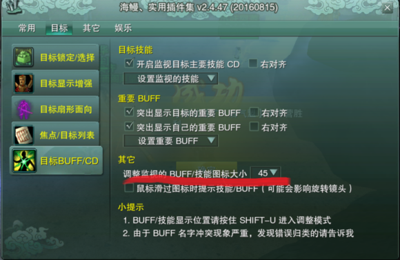 这里主要也是一个监控图标的大小设置,看着舒服即可。至于上面的设置监视的技能、设置重要的buff,对于萌新来说,不去动它就行了,等以后熟悉了各职业技能,再去里面按自己的需要增减。