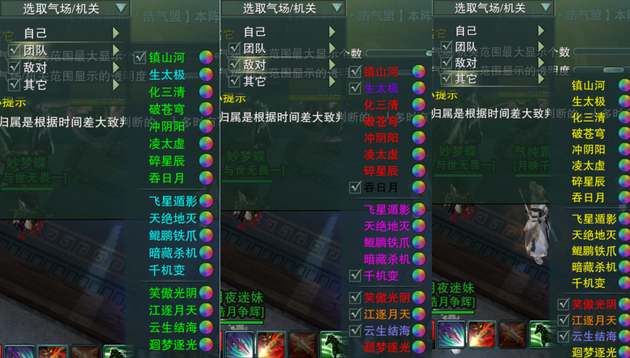 首先,气场机关范围,这页照搬即可,可以直观地显示其他门派的气场、音域等技能。这里的重点在“选取气场/机关”这里。