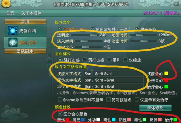 红色框起来的部分,就是区分会心颜色,开启后能明显分辨技能是否会心,需要修改的仅仅是右上角红圈的“技能会心”颜色,个人喜欢改成黄色(基本类似魔兽世界),即R(255)G(255)B(0)。至于右下角的“字体修改”,是对打出伤害的字体的改动,个人喜欢实体的“剪纸”,比较符合剑三的默认伤害字体,而且可以通过“茗伊字体管理”显示成“方正粗圆”哦。