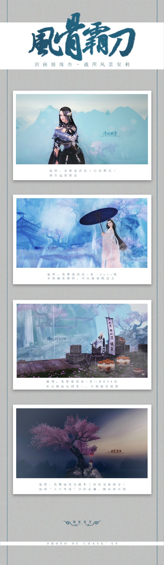 我的截图历程大概就是:开始前期很喜欢找有景的地点,中后期就喜欢找地图背景然后后期简单合成,最近又开始找一些比较喜欢的风景了。(所以这7p里的后期风格跟修图水准分了好几个阶段……见谅。)