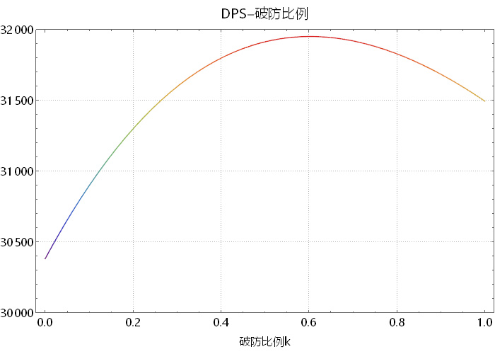 对于每一个k,代表穿破防装备和双会装备的一个比例,都对应了一个面板,那么就可以算出一个DPS,那么就可以画出DPS对 的图像如下: