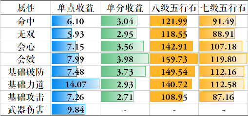 命无我们按照先堆107%命中,剩下的属性点都给无双,再加上人物初始属性。那么最后面板是1178力道,4356最终攻击,479武器伤害,107%命中,40.2%无双,209加速等级。然后就到了2333点会心会效破防的分配,注意装备上的会心会效是绑定的,同品同部位装备提供的 破防:会心:会效=16:11:5。也就是说这2333点属性