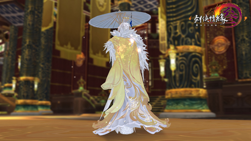 “沉醉东风·透碧宵”为侠士喜闻乐见的小清新款披风,采用清雅素净的森系配色,同样具备质感优异的半透明材质,搭配精心打造的鲜花装饰,让每个弧度优雅得体。使用轻功后,将有青色花朵在空中绽放,彰显了拥抱自然的生活态度。