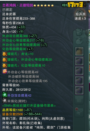 同时,也有一部分装备我们称之为“精简装备”,这类装备的特点是某一属性特别高,但是相对于同等级装备少几条固定属性,这部分精简装备大部分只能精炼到四级或者三级
