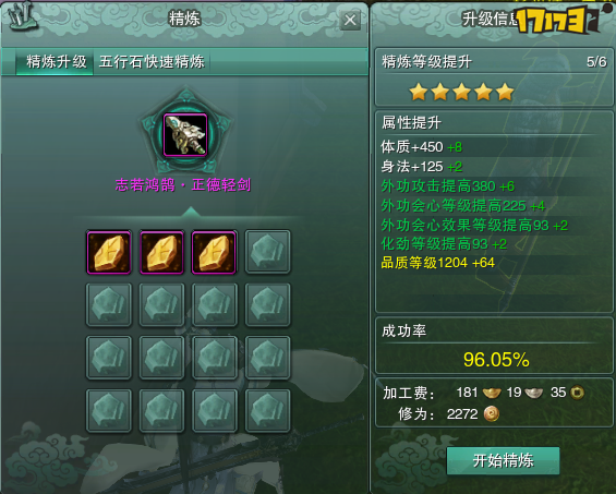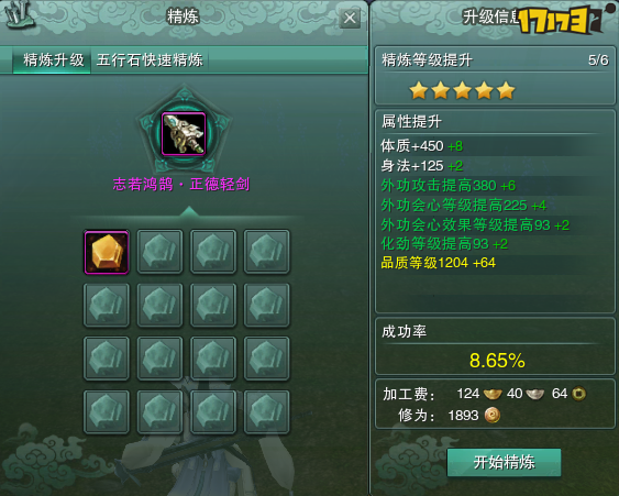 精炼面板中会显示这次精炼会给你的装备提升多少属性,这次精炼的成功率多少,这次精炼装备所消耗的修为和金币是多少