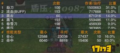 针对这两个比例图,我们先看五分钟的木桩,他的循环下,有60个盾击,他每次循环打出一套三盾击,20轮循环,60盾击,100劫刀,优秀的比例。