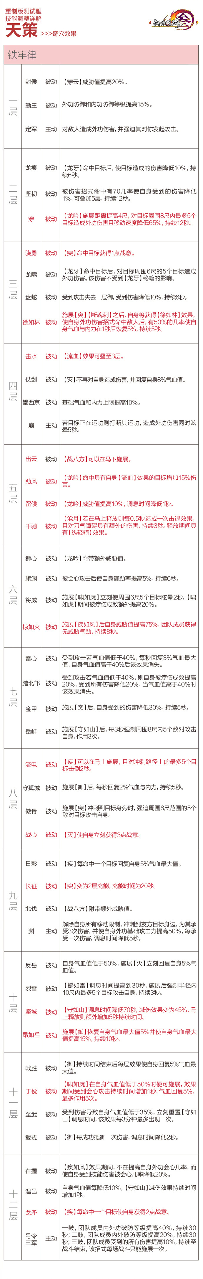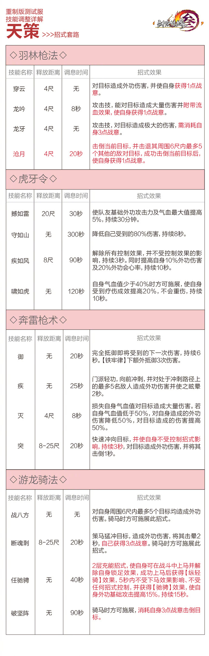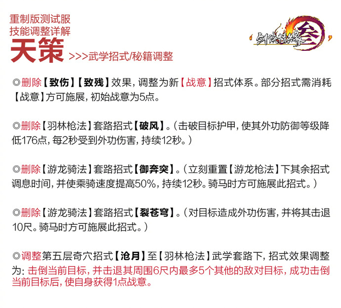 剑网3重制版天策技能改动 官方表格数据一览 2017-11-01 17:25 新浪游戏 0 剑网3重制版二测今晚20:00开启,技能武学爆料抢先看~~ 【天策】门派改动如下,其他门派稍后陆续奉上~小伙伴可前往测试服实战体验,技能异常可直接通过游戏进行反馈,最终改动以正式服为准。
