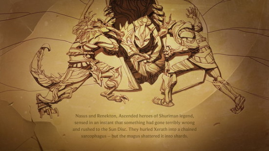 恕瑞玛传说中的飞升英雄,内瑟斯与雷克顿,立刻就感觉到了不妙,并冲到了太阳圆盘的地方。他们用力把泽拉斯锁在了一个石棺之中,但泽拉斯把它撕成了碎片。