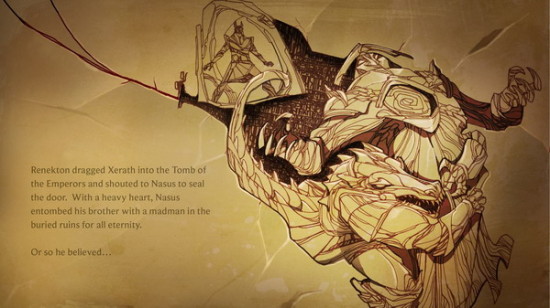 雷克顿把泽拉斯拖到了皇陵之中,并呼喊内瑟斯封印那座大门。内瑟斯怀着沉重的悲痛之情,把自己兄弟与疯子一起完全埋葬了。
