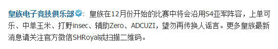 昨日,皇族终于发布了官方的声明,称队伍将沿用S4时期的阵容开始12月份的比赛。队内并没有进行人员调整。
