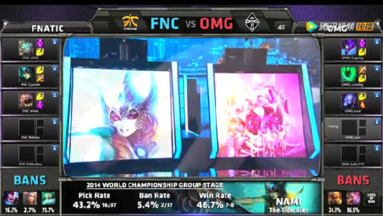 整场比赛都很胶着,Soaz初期的失误使得OMG取得些许优势吗,但中期Fnatic更胜一筹的团战将劣势扳回来。没有一支队伍能在40分钟后还继续保持优势。
