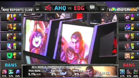 当EDG拿到一套Poke阵容之后,就注定了如果EDG不能前期彻底击垮AHQ,那么对手就会反噬他们,结果,在EDG经济领先却找不到开团契机的时候,AHQ的辅助绿茶的锤石和中单西门的劫为战队立功,被西方媒体誉为世界第一ADC的娜美一次走位不慎,被锤石钩中,随后,有着复活甲的火影西门杀入人群,如常山子龙一般击杀三人,自己却安然无恙,AHQ一波推掉了EDG的基地水晶,将小组实力强劲的对手EDG逼入加赛的深渊边缘。