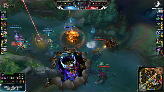 在上面的这幅图中,Lee和Smeb共同筑起了不可逾越的前排,迫使Jin Air不得不被动的用出自己所有的技能,可想而知,虎牙的Carry英雄接下来能够顺利的进行收割了。