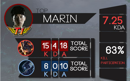 然而,随着季前赛的进行,我们可以清晰的看出这是Marin在一直更加激进的队伍中所体现的个人技术。整个季前赛中,他的个人KDA有7.25,几乎是在2014年夏季赛当中的四倍。Marin已经证明了自己是韩国最强的上单选手之一。