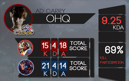 Ohq是一位拥有超强个人技术,走位又非常出色的选手。他的缺点就是大局观念不够强,需要队友明确的指挥和持续的提醒。在没有明确的指挥时,Ohq会选择在线上刷兵然后打野。自己一个人的时候,Ohq的表现似乎乏善可陈,但是有了像Cain这样经验丰富的帮手,他很快变得不可阻挡。