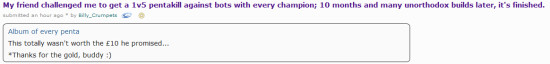 结果这位大兄弟为了完成赌约花了十个月的时间完成了这一约定,得到了来自他好兄弟的10英镑的“奖励”。话说这十个月期间还新出了好几个英雄,算不算为赌约增加了工作量了呢?