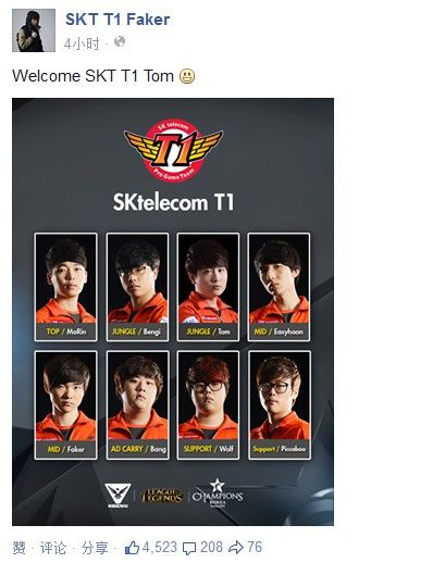 经历了俱乐部的深思熟虑和多番海选,S3世界冠军SKT T1英雄联盟战队再填新丁——SKT T1 Tom。据悉,这位选手上场后将和Bengi分享上场时间,机制与Easyhoon和Faker的分享机制类似,相信这一举动能够让Bengi不再承受那么大的压力,能够更轻松的比赛了。