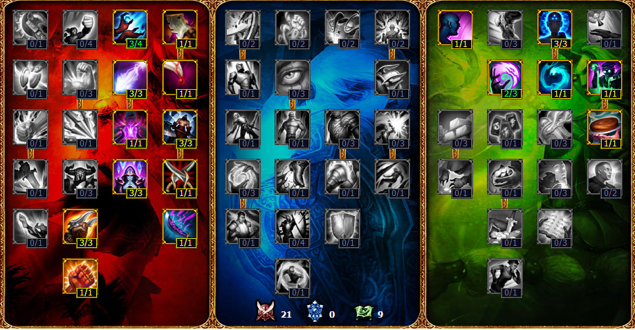 Faker采用的是21-0-9的暴力法师天赋,21点的攻击天赋点出传统的法师天赋即可,屠夫与盛宴保证妖姬前期的线上续航能力,死神与危险 游戏是作为法师刺客的妖姬必点的攻击天赋,增加妖姬的收割能力。奥数之刃可以考虑点出,妖姬在前期经常需要平A来消耗敌人,剩余的9点点在通用中,通用天 赋的回蓝十分适合妖姬,炼金精通与烹饪大师能够大大增加妖姬的药品回复,保证妖姬前期的发育。