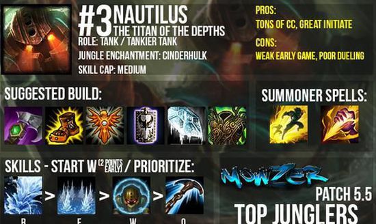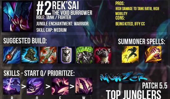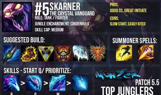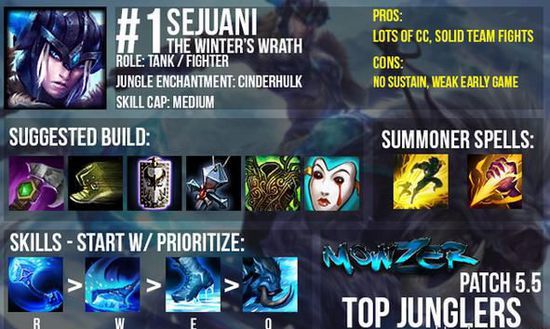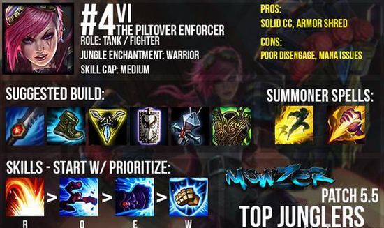 大家好,我又来了!游戏之所以让我们感到新鲜有趣,是因为一切都在不挺的变化,而打野英雄的表现也起起伏伏。这就是英雄联盟出装以及游戏风格多样性 的源泉。那么,今天为大家带来了5.5版本单人排位赛的打野英雄排名,方便那些不喜欢看补丁说明的打野玩家,同样也能够为其他的玩家分析一下当前版本当中 打野英雄的状况。我直到并不是所有人都会同意我的看法,但是我非常喜欢为大家提供这样一份榜单,希望可以为你们提供一些帮助。