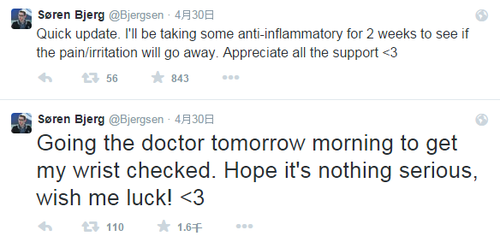 在5月1日的时候,《英雄联盟》北美冠军选手Bjergsen在推特中公布了自己的近况,他最近需要注射两周的消炎药物来消除软组织挫伤的疼痛,这是近日有关电竞选手受伤的第三起消息了。之前Cloud 9战队的选手Hai也是因为手腕受伤而选择退役。