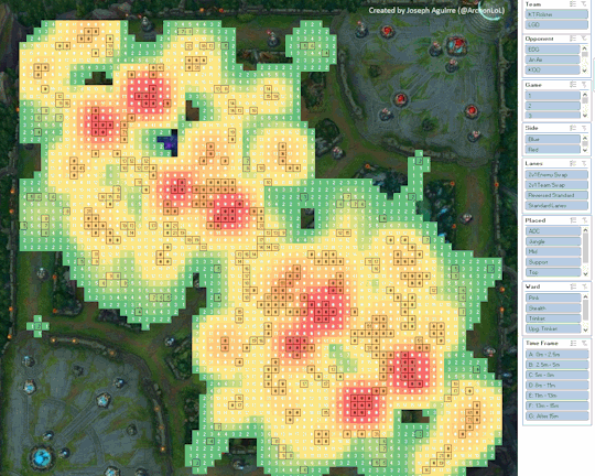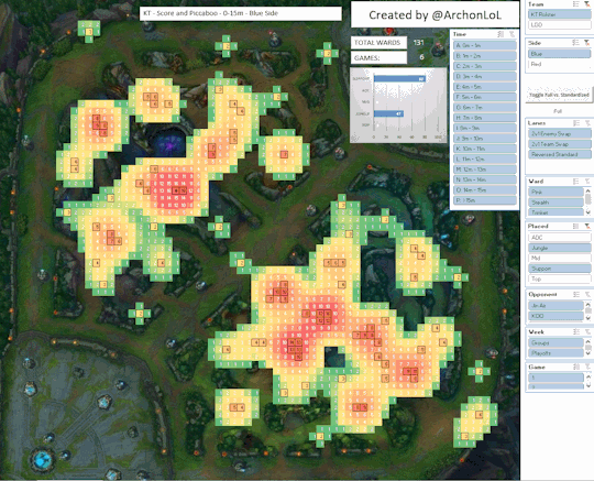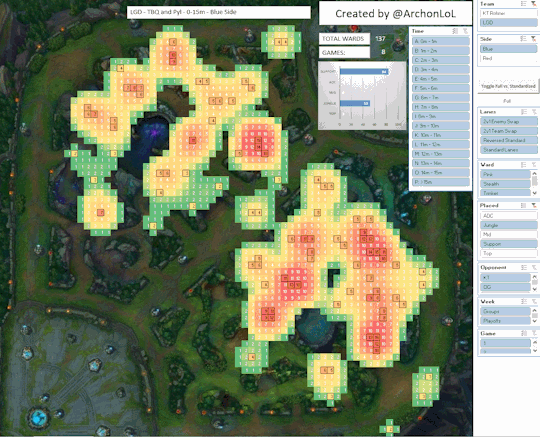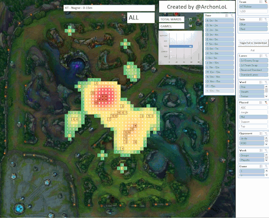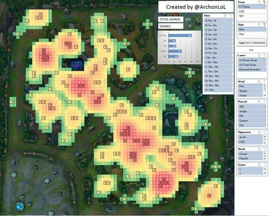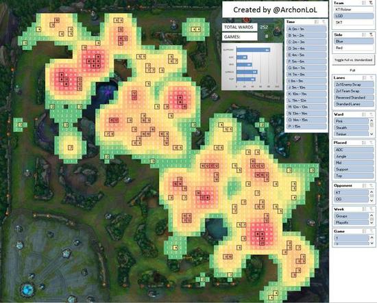 以下是用Excel程序制作的2015世界总决赛概述。本程序收录了超过1500个LGD与KT的眼位记录。这个程序让我们可以实时监控他们的插眼行为,插眼时机,和更准确的位置。