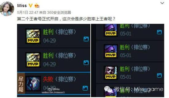 前几天,Miss大小姐终于上王者了,最近还在准备第二个号上王者。