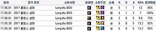 在龙珠战队的首秀,BDD就对上被认为是强队的KT战队,他没有选择自己众所周知的刺客英雄,而是两把都选择奥莉安娜。比起对手Pawn他两局比赛补刀和人头数都领先对手,并且打得既谨慎又能带动全局,最终龙珠战队-0击败了KT战队,而他的奥莉安娜一次都没有死过。