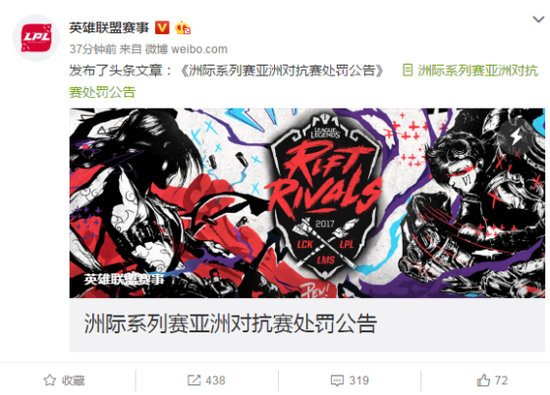 处罚:Team WE战队将会以五人无替补阵容参加本次洲际系列赛亚洲对抗赛,并且将被罚处150,000台币。