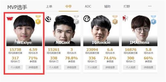 春季赛上,xiye依靠强劲的个人实力,多次斩获MVP,并多次登上中单选手MVP榜第一位。